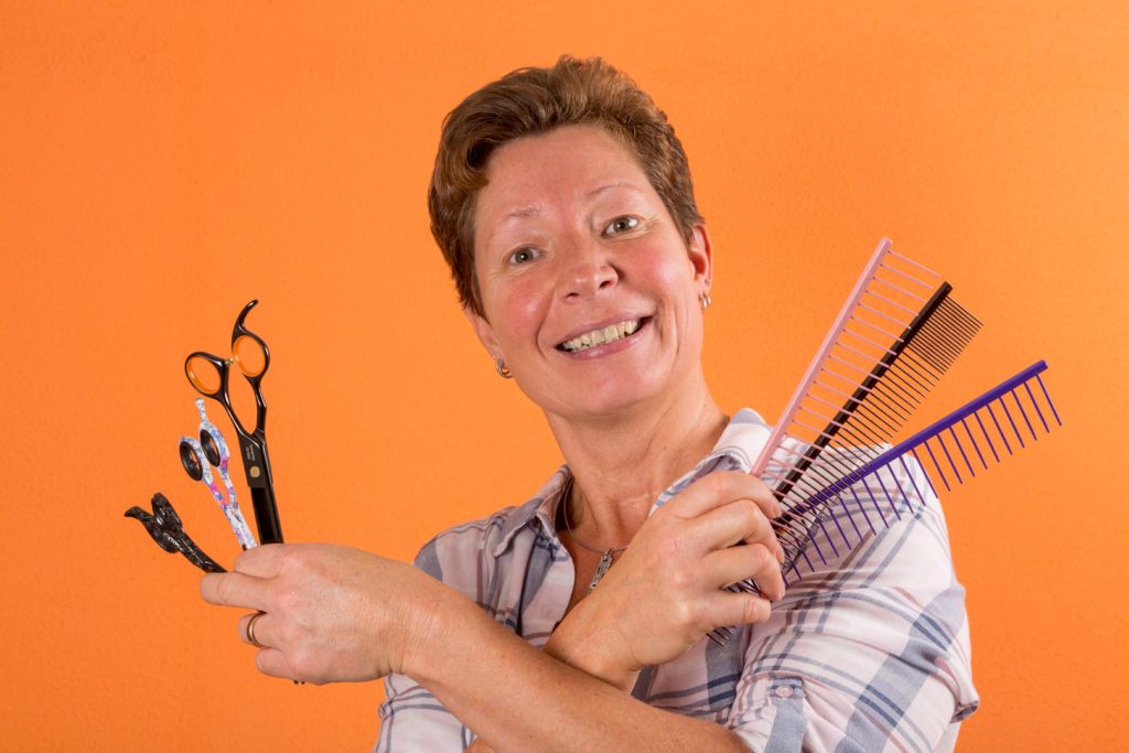 UM DEM HUND EIN SCHÖNES AUSSEHEN ZU VERLEIHEN, WIRD DAS FELL MIT UNTERSCHIEDLICHEN SCHEREN IN FORM GESCHNITTEN.